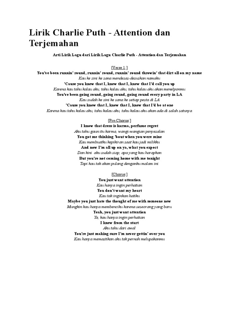 Anda telah menjalankan putaran runnin putaran runnin putaran lempar kotoran itu semua atas nama saya. Arti Terjemahan Lirik. Lirik Attention dari Charlie Puth ini dipublikasikan pada tanggal 22 Juli 2017 5 tahun yang lalu dan diciptakan oleh Jacob Kasher Charlie PuthBelum ada info detil tentang single ini.